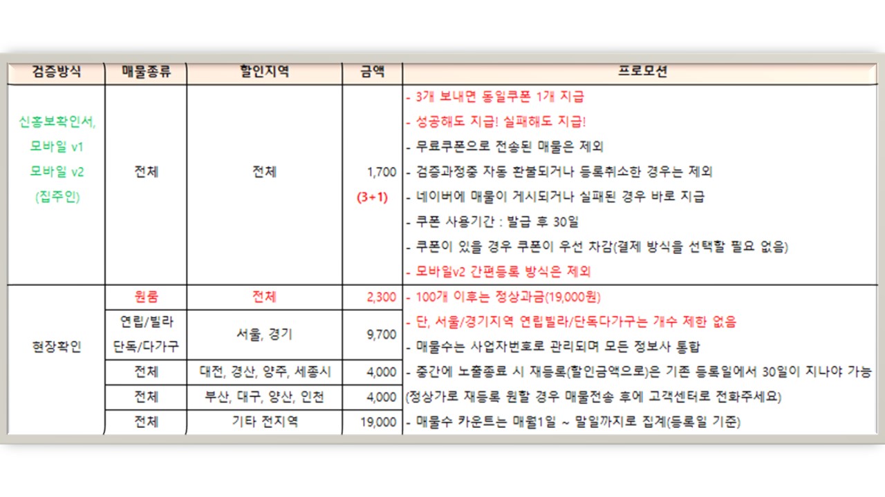 * 집주인(모바일1, 모바일2, 신홍보 방식) 검증방식 : 3+1 쿠폰 지급 * 원룸현장 : 2,300원