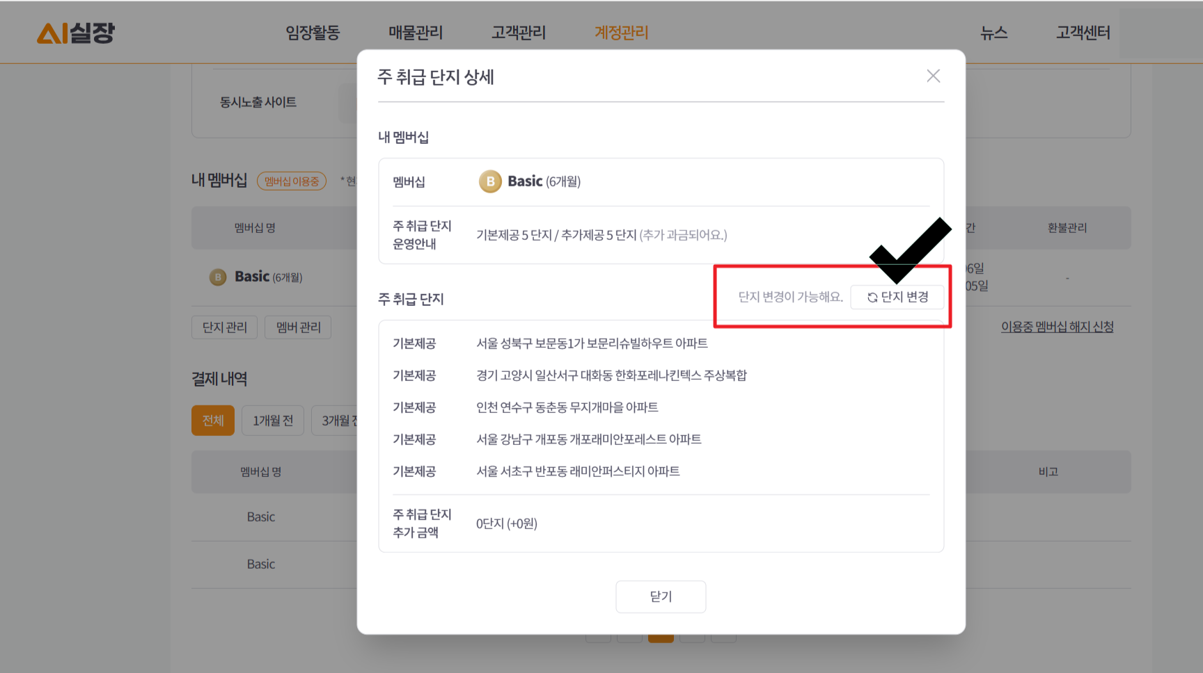 변경 순서는 계정관리> 결제관리> 단지관리> 단지변경> 단지저장