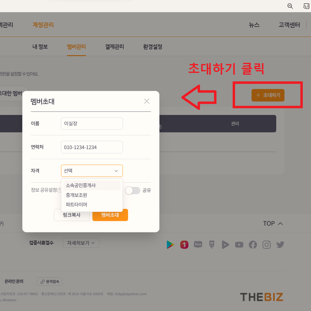 5. 오른쪽 이미지처럼 초대하기를 누른 후 팝업창이 나오면 이름, 전화번호, 포지션을 선택합니다.