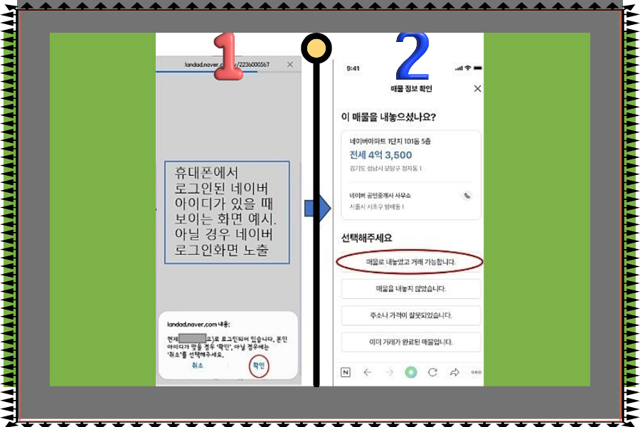 먼저 모바일확인(v1)으로 매물 등록 후 통상적으로 10분 정도 후 소유자에게 네이버에서 1588-0332 번호로 문자를 보내긴 하지만 1588 번호가 스팸처리가 된 경우도 있고 소유자가 온라인에 익숙하지 않아서 확인 인증이 느려지는 단점이 있는데요.