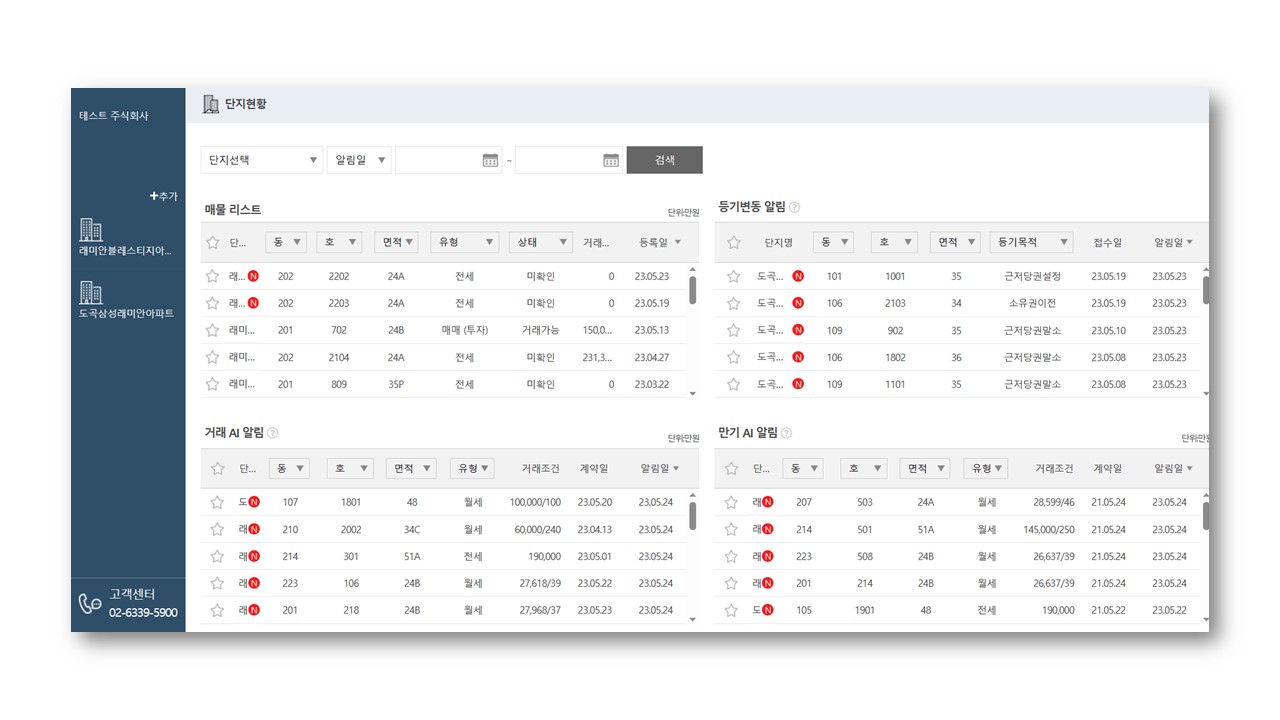 2. eNote 회원가입 후 구매 단지 기준으로 호실 별 전월세 소유자명이 제공됩니다.