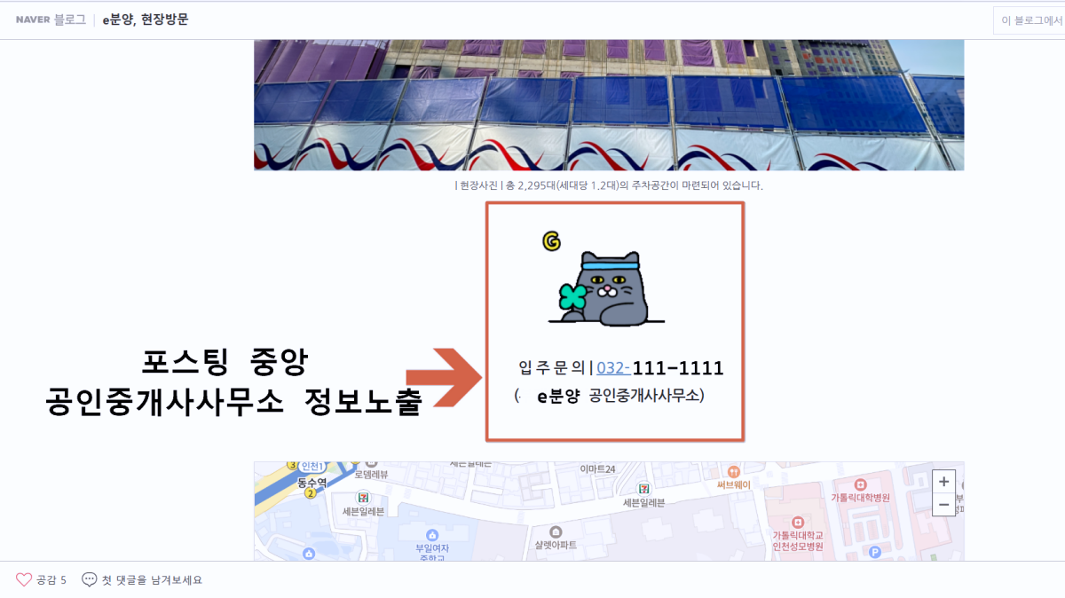 e분양에서 현장확인 직원이 직접 촬영 및 자료를 수집하여 고객이 직접 방문하지 않아도 한 눈에 확인할 수 있는 입주 단지 정보를 브랜드 블로그로 포스팅하여 문의처 제공으로 연락받을 공인중개사사무소 함께 네이버 부동산 단지정보에 단독으로 노출해 드리는 서비스입니다.